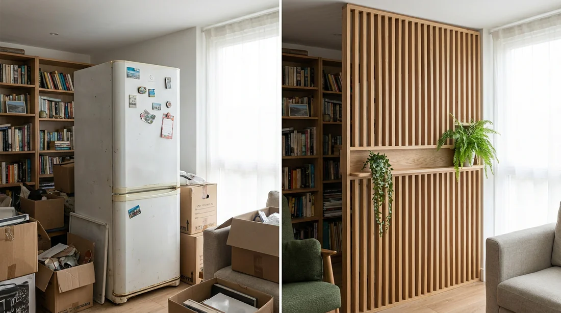 Côté salon, vous gagnez une étagère déco ou une bibliothèque pour vos livres de recettes. Côté cuisine, le frigo disparaît. L'utilisation de MDF de 18 mm ou de mélaminé assorti à vos façades donnera un rendu « sur-mesure » très propre.
